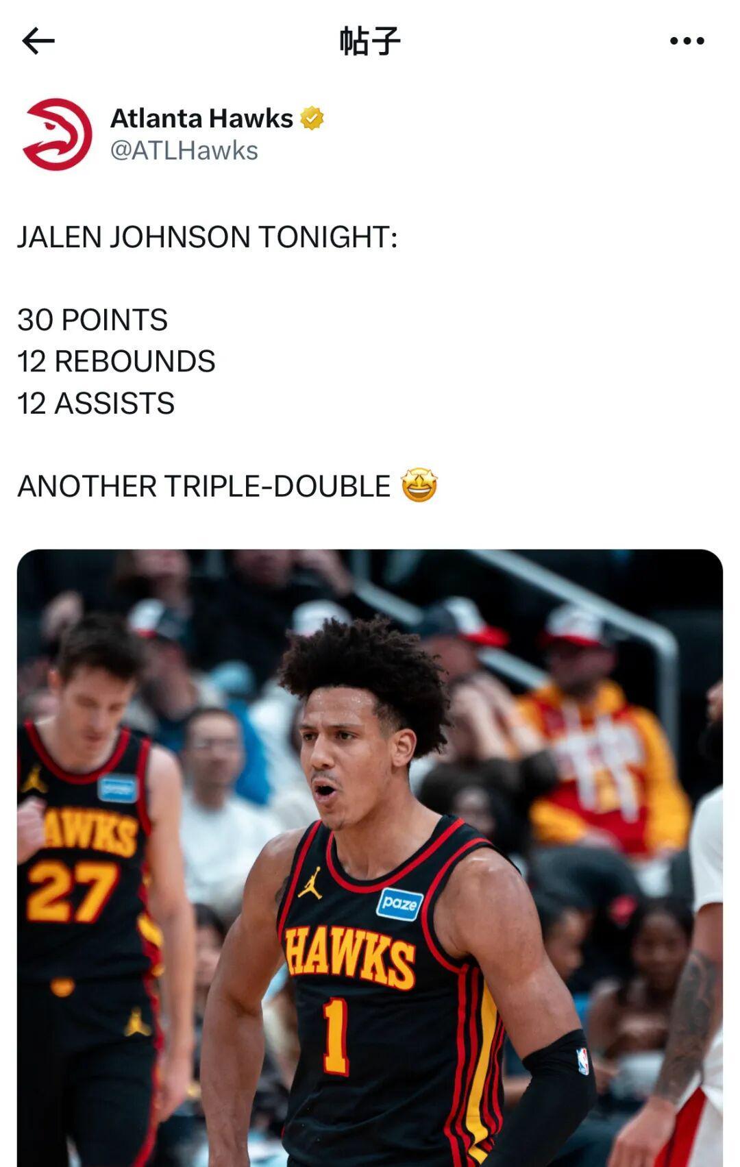 这两场比赛过后,老鹰在官方晒图感叹道:过去24小时的杰伦约翰逊,51分30篮板28助攻,天呐(Sheesh)。